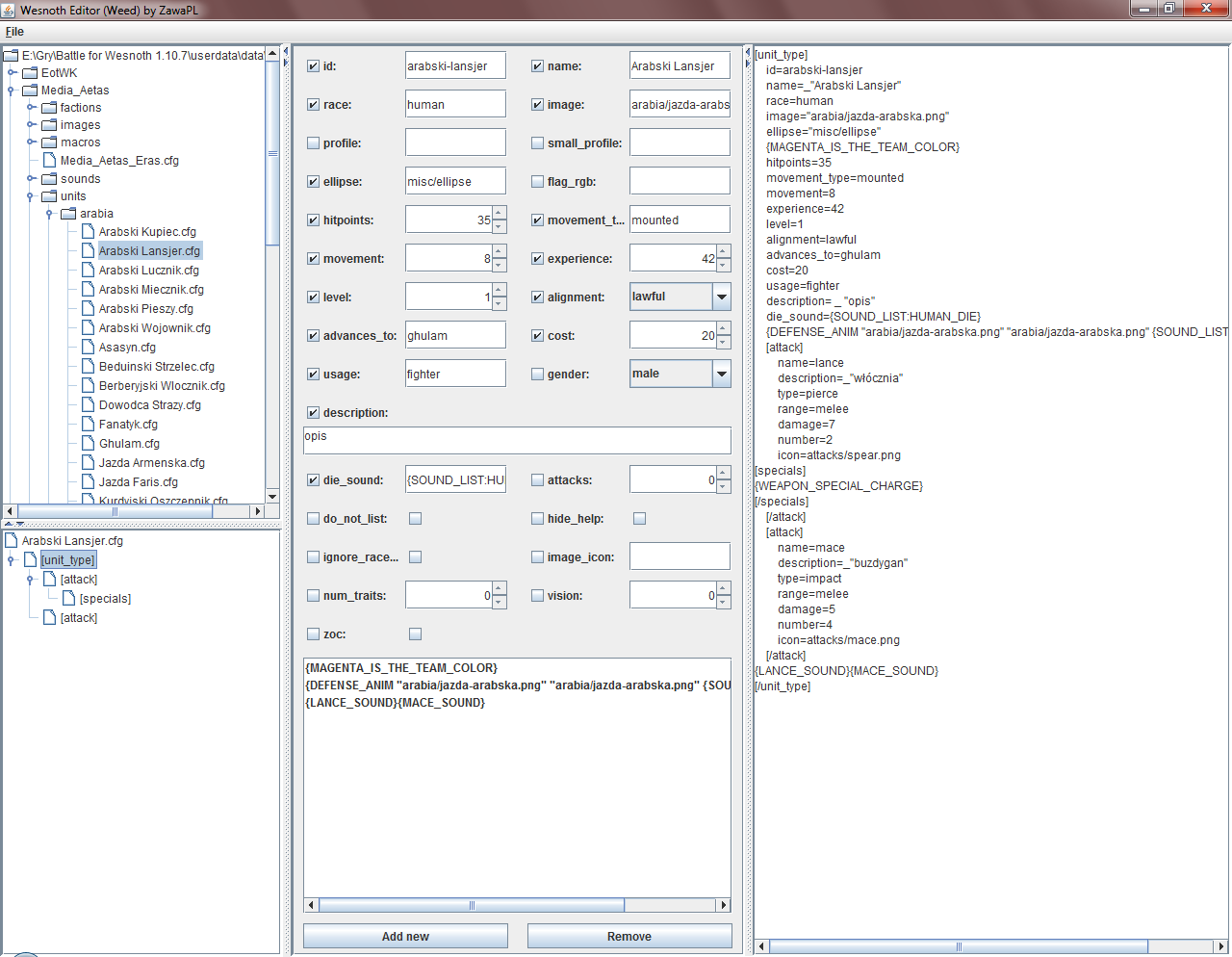 W każdym bądź razie postanowiłem zrobić edytor do WML'u. Obecnie skupiam się tylko na edytowaniu jednostek(czyli tagi [unit_type], ale jeśli dobrze pójdzie rozwinę go na inne tagi. Nie słyszałem o żadnych edytorze(przynajmniej nie aktualnym), a jako że mam trochę czasu i chęci to postanowiłem pobawić się w stworzenie czegoś takiego.